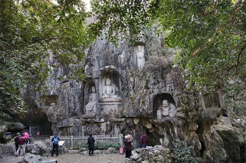灵隐寺留存着各朝代的精美文物,寺内宝物汇集,有康熙皇帝到此南巡所题云林禅寺牌匾, 山上还有许多奇形怪状的洞壑,以及佛教石窟造像。