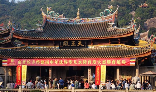 南普陀寺面朝大海,背靠大山,其建筑规模宏大,气势雄伟,寺内有四大殿阁,其中天王殿最为壮观,其位于寺院中轴线最前端, 里面供奉笑容可掬的弥勒佛,两侧立有怒目环视的四大天王。