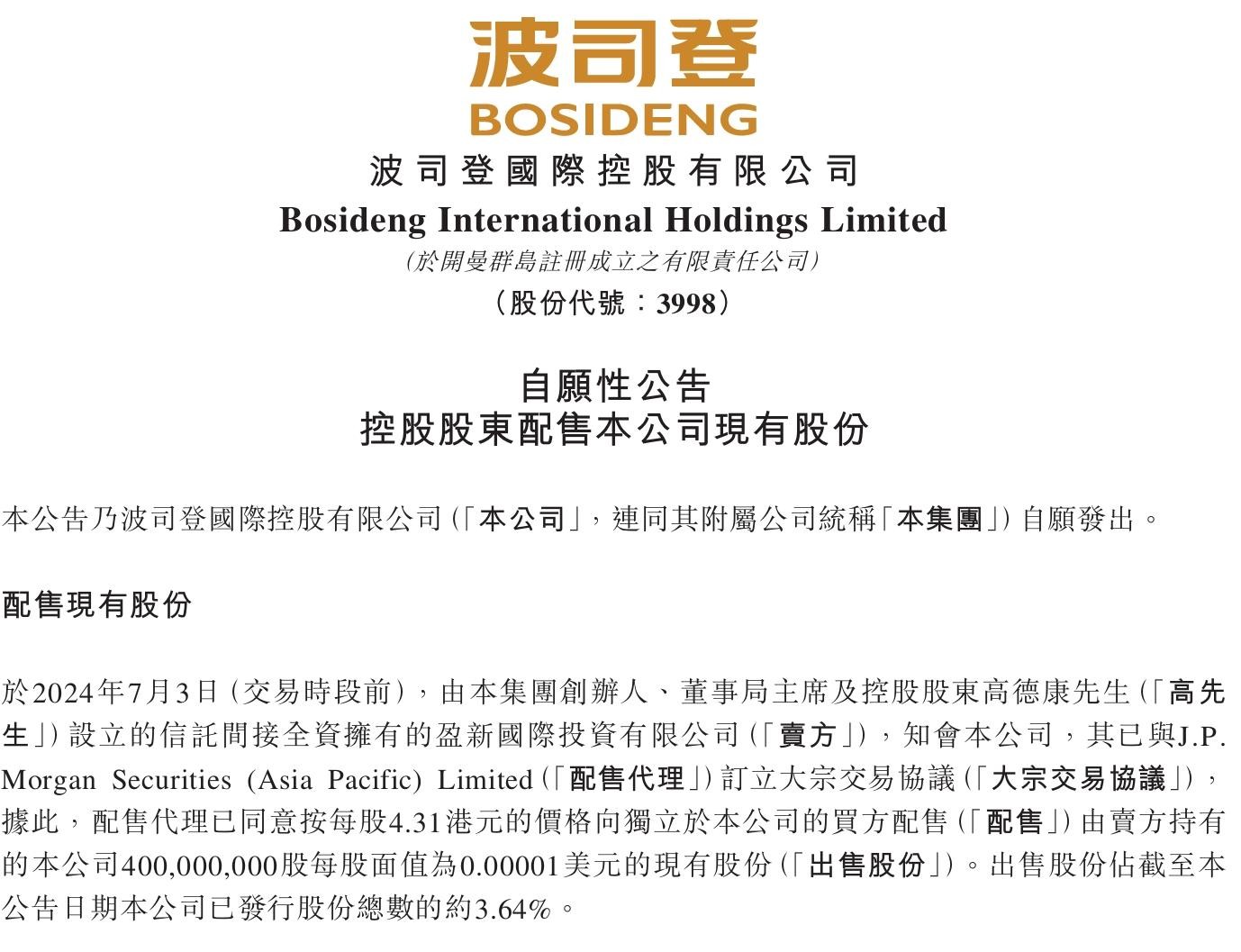 2024年7月3日,波司登发布公告称,公司创始人、董事局主席及控股股东高德康设立的信托,通过全资子公司盈新国际投资有限公司与配售代理签订大宗交易协议,以每股4.31港元的价格向买方配售公司4亿股股份,占公司已发行总股本的3.67%。