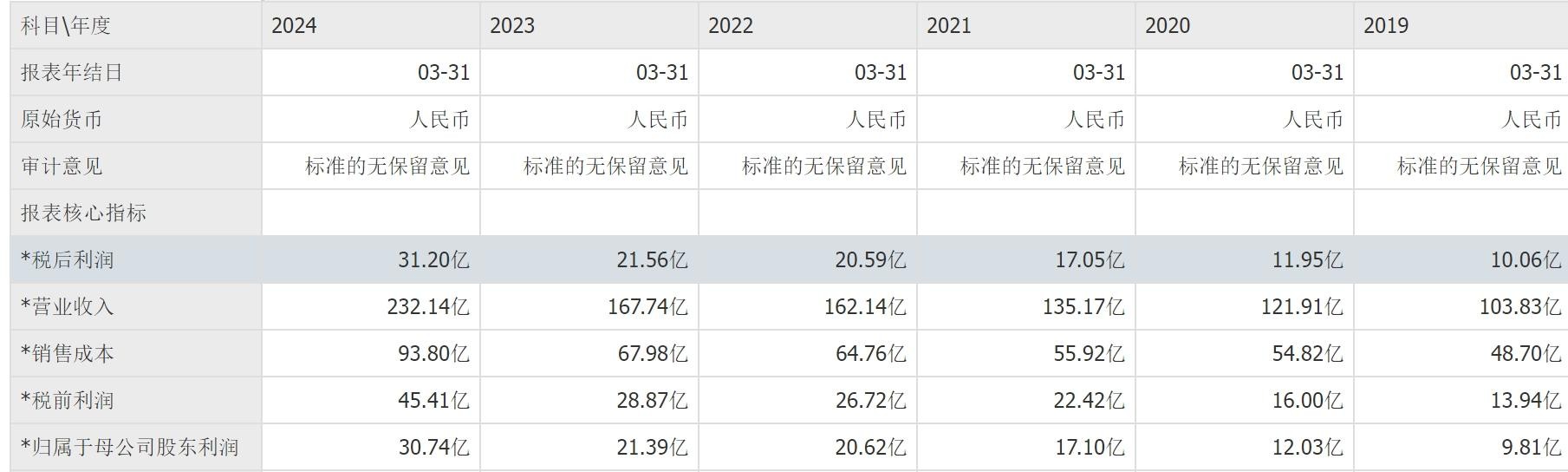 从财报数据来看,波司登的业绩在近年来确实取得了显著增长。2019财年至2023财年,波司登营收分别为103.83亿元、121.91亿元、135.17亿元、162.14亿元、167.74亿元;净利润则分别为9.81亿元、12.03亿元、17.10亿元、20.62亿元、21.39亿元。