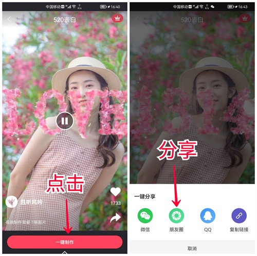 挑选一个关于520表白的模板,查看视频效果,觉得还不错就点击「一键制作」,然后添加你们的照片,就能自动生成特效视频了,最后分享到「朋友圈」。