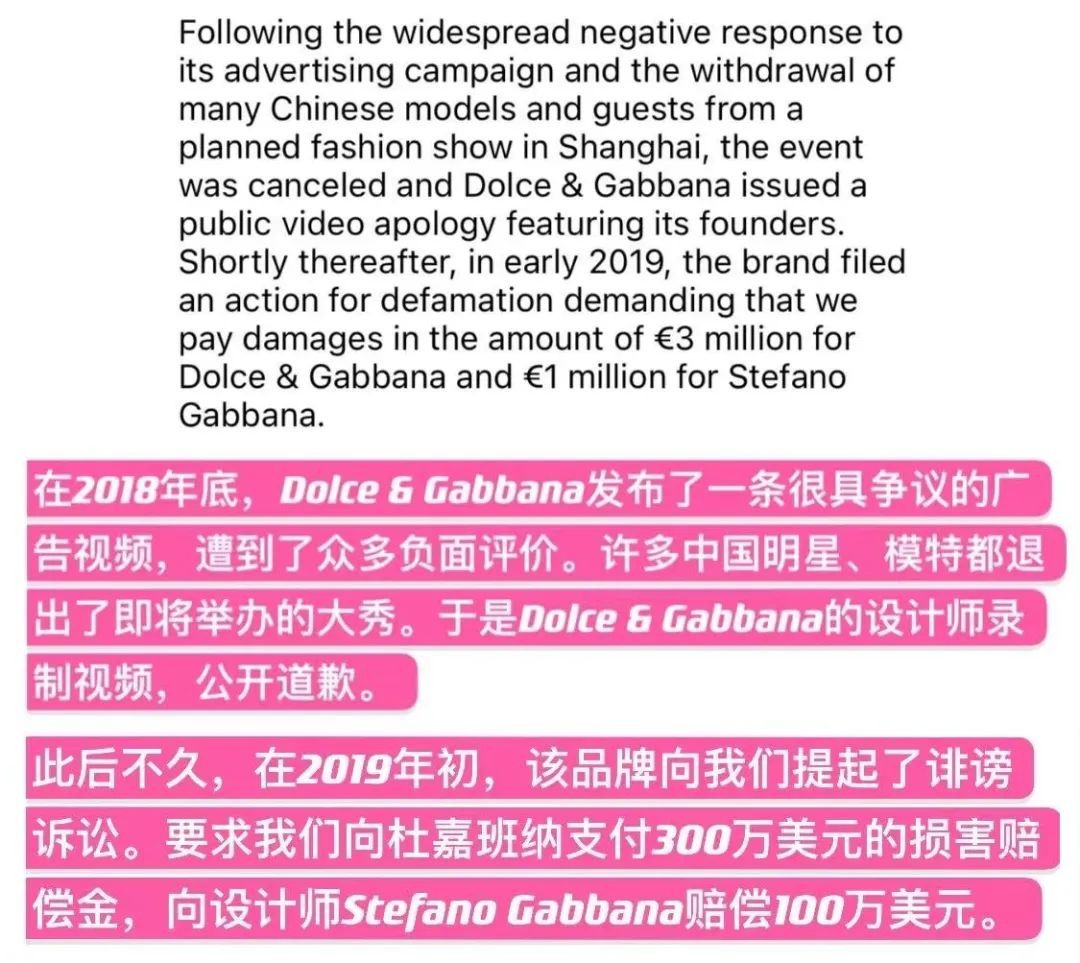 DG向他们提起了400万美元的诽谤赔偿官司,其中100万,还是要赔给“胡言乱语”的设计师Stefano Gabbana本人……