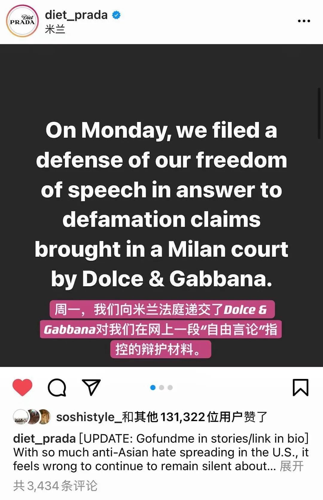 曾经奋战在批评Dolce & Gabbana(后称DG)第一线的账号: @diet_prada 前几天突然发文称:自己被DG告了……