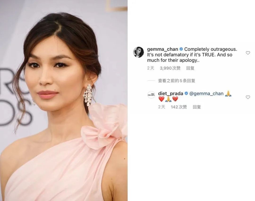 英国华裔女演员Gemma Chan作为屈指可数的好莱坞主流亚裔明星,在diet_prada的评论区发文声援他们:“简直离谱”。
