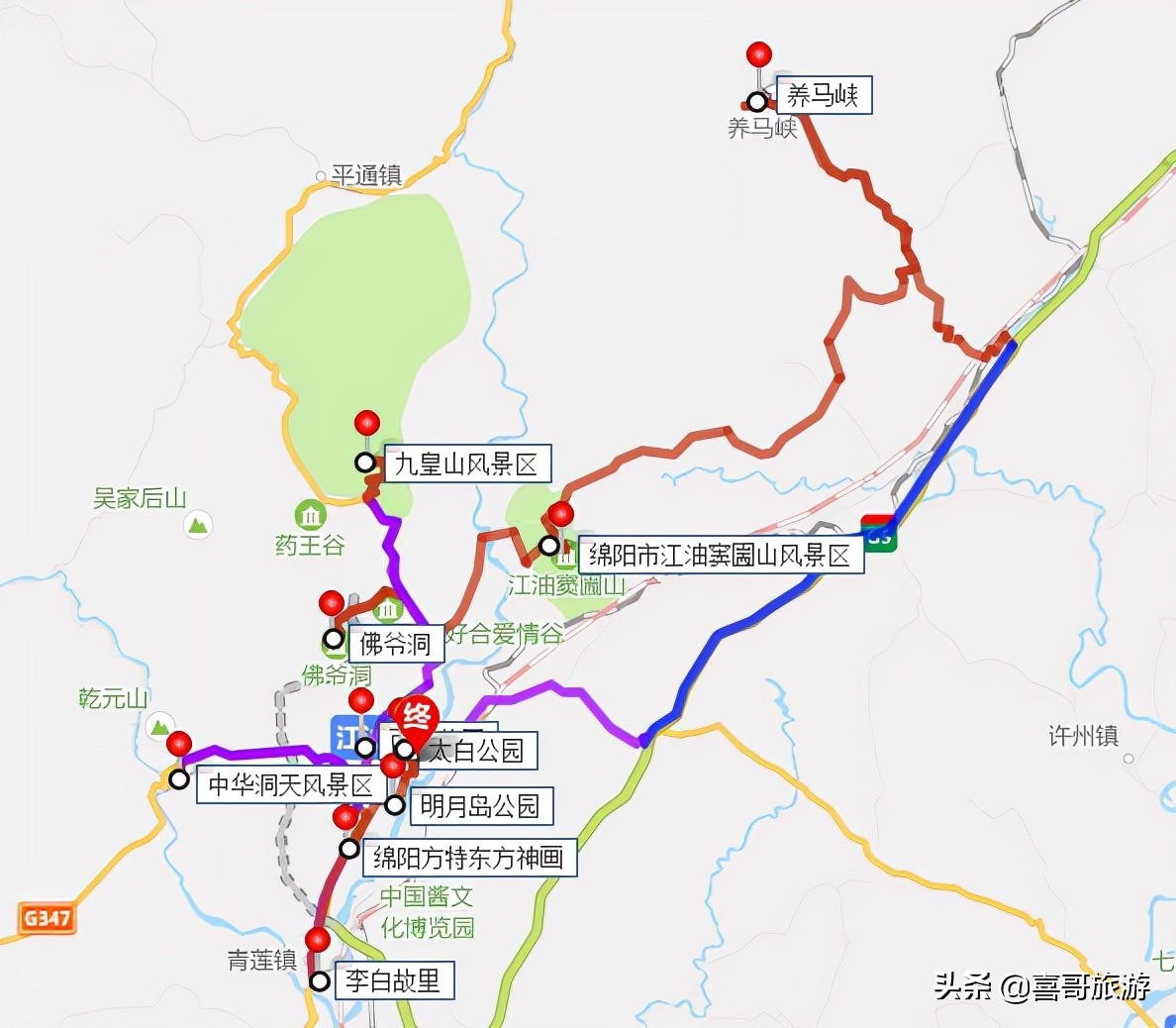 自驾游交通路线:四川江油市-江油市城区-347国道-京昆高速公路-中雁路-厚六路-养马峡。全长71.4公里,车程2小时4分钟。