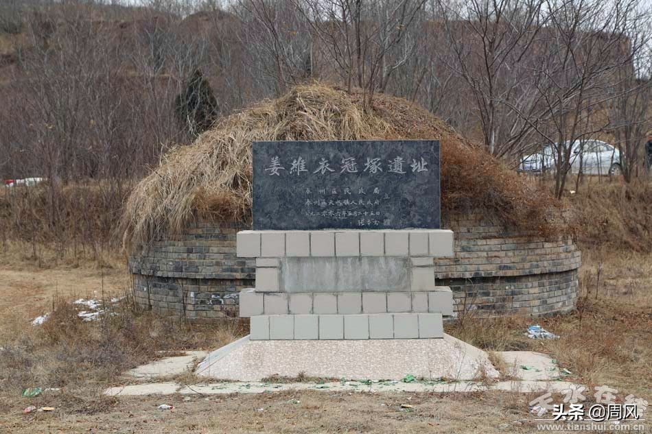 天水关姜维墓坐落在天水市秦州区天水镇东北的黄家坪山顶,左面为石家峡,右面为铁堂峡。铁堂峡不仅是西汉水上游的流经之地,也是由陇入川的古道和军事要塞。姜维墓山脚下的三角形川道里,曾是抚夷将军姜叙镇守过的历城,正前方便是赫赫有名祁山。