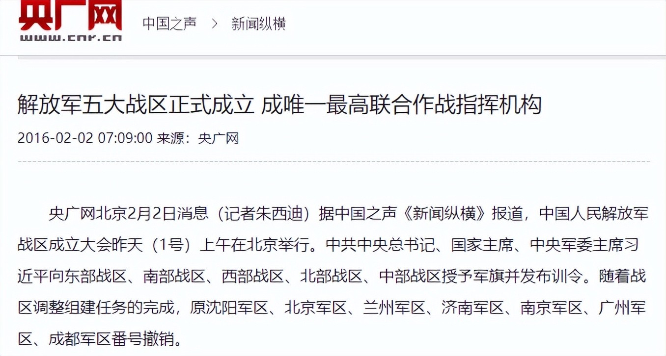 信源:解放军五大战区正式成立 成唯一最高联合作战指挥机构=2016-02-02 07:09:00 来源:央广网
