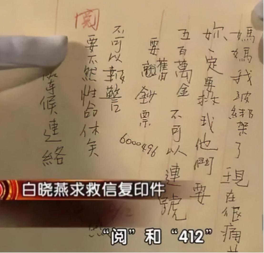 塑料袋里面装着一截手指、三张半果照以及女儿白晓燕的一封求救信“妈妈,我被绑架了,现在很痛苦,你一定要救我,不可以报警!”