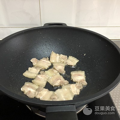 4、锅中留底油,放入五花肉片翻炒2分钟,至断生