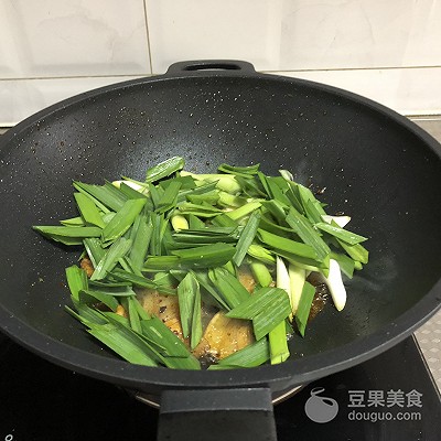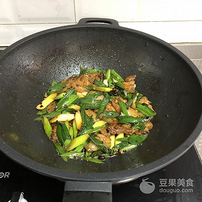 6、放入青蒜,翻炒至青蒜断生
