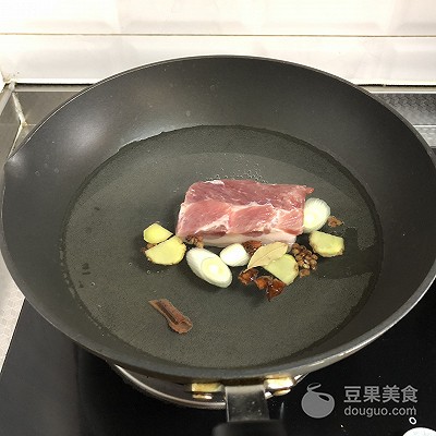 2、五花肉带皮冷水下锅,锅中放入葱姜,花椒,桂皮,八角,香叶,大火烧开后转中小火煮15分钟