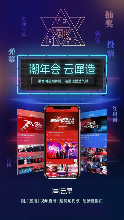年会节目里的年会游戏设置是否有好玩,气氛嗨不嗨在一年一度的年会里,显得非常的重要。将欢乐的时刻,通过影像方式记录下来更是十分有意义和有必要。而云犀为企业提供的统筹式影像拍摄服务,将专业的帮助企业进行诸如年会等各类活动的视频直播/拍摄、图片直播/拍摄、 短视频制作等。