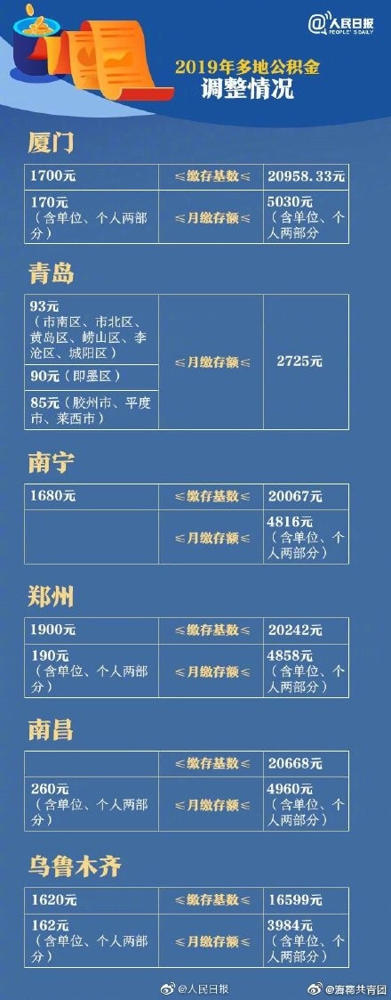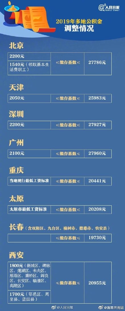 2019公积金调整期到来!近期,北京、天津、深圳等地已发布住房公积金调整方案,均从7月1日起实施。其中深圳、重庆、天津与乌鲁木齐上调了缴存基数上限,较上年分别上调2883元、2123元、1743元与1200元。北京、青岛与南昌则上调了月缴存额上限。调整后,北京市月缴存额上限为6668元,上调572元;青岛市月缴存额上限为5450元,上调438元;南昌市月缴存额上限为4960元,上调598元。