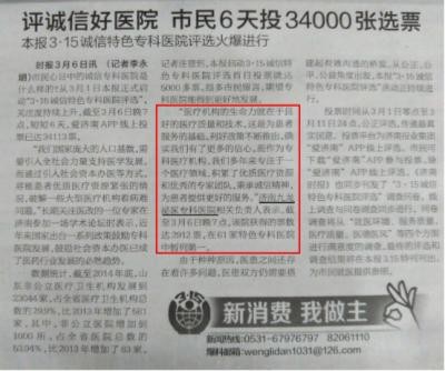 据报道,3·15诚信特色专科医院评选首日投票就达5000多票,很多市民留言,期待专科医院能得到更好地发展。从3月1日济南时报正是启动“3·15诚信特色专科医院评选”活动以来,关注度持续上升,截至3月6日晚7点,短短6天,爱济南APP线上投票已达34113票。其中一直本着诚信为本、服务为民的济南九龙泌尿专科医院票数不断增长,最终跃居第一,成为本次评选活动的领头羊。