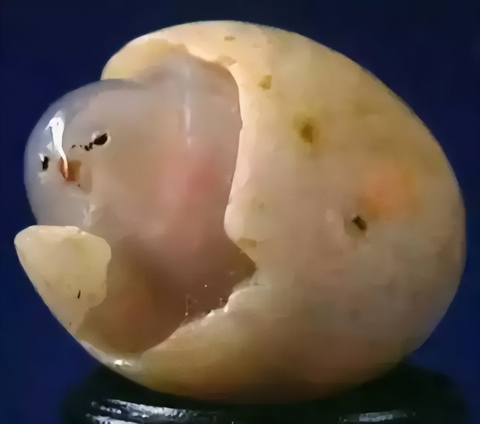 小鸡出壳的由来:这块玛瑙看起来像一只淡黄色的小鸡,啄破蛋壳后正探头往外看,留半个身子在蛋壳中,色彩艳丽,栩栩如生。