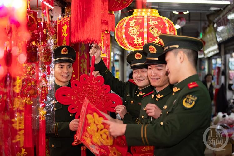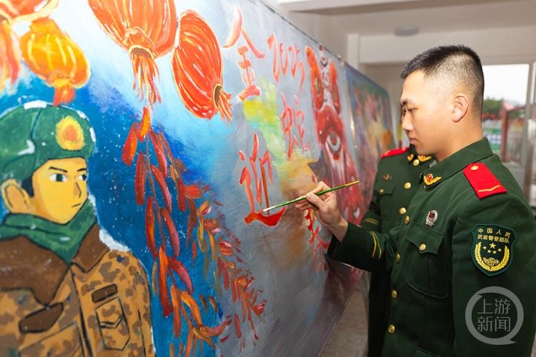 营区内,官兵们分工明确,火红的灯笼、吉祥的中国结、手写的春联,把军营装扮得喜气洋洋、年味十足。