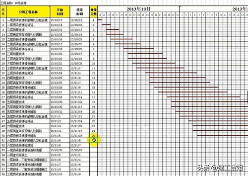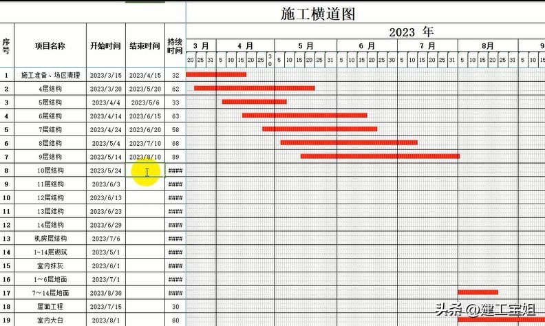 新手如何快速学会使用Excel横道图,这是新手画的横道图,这是项目经理画的横道图,工程开始和结束时间咔咔一填写,就能直接计算出工期天数,横道图也同一时间自动生成红线,施工进度一目了然,既方便又专业,对工程朋友超级实用.