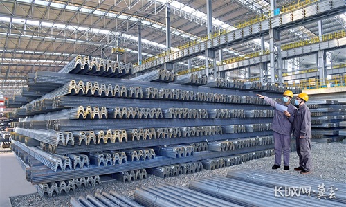 河钢集团唐钢公司长材事业部青年职工在抽查U型钢产品质量、核对订单信息。