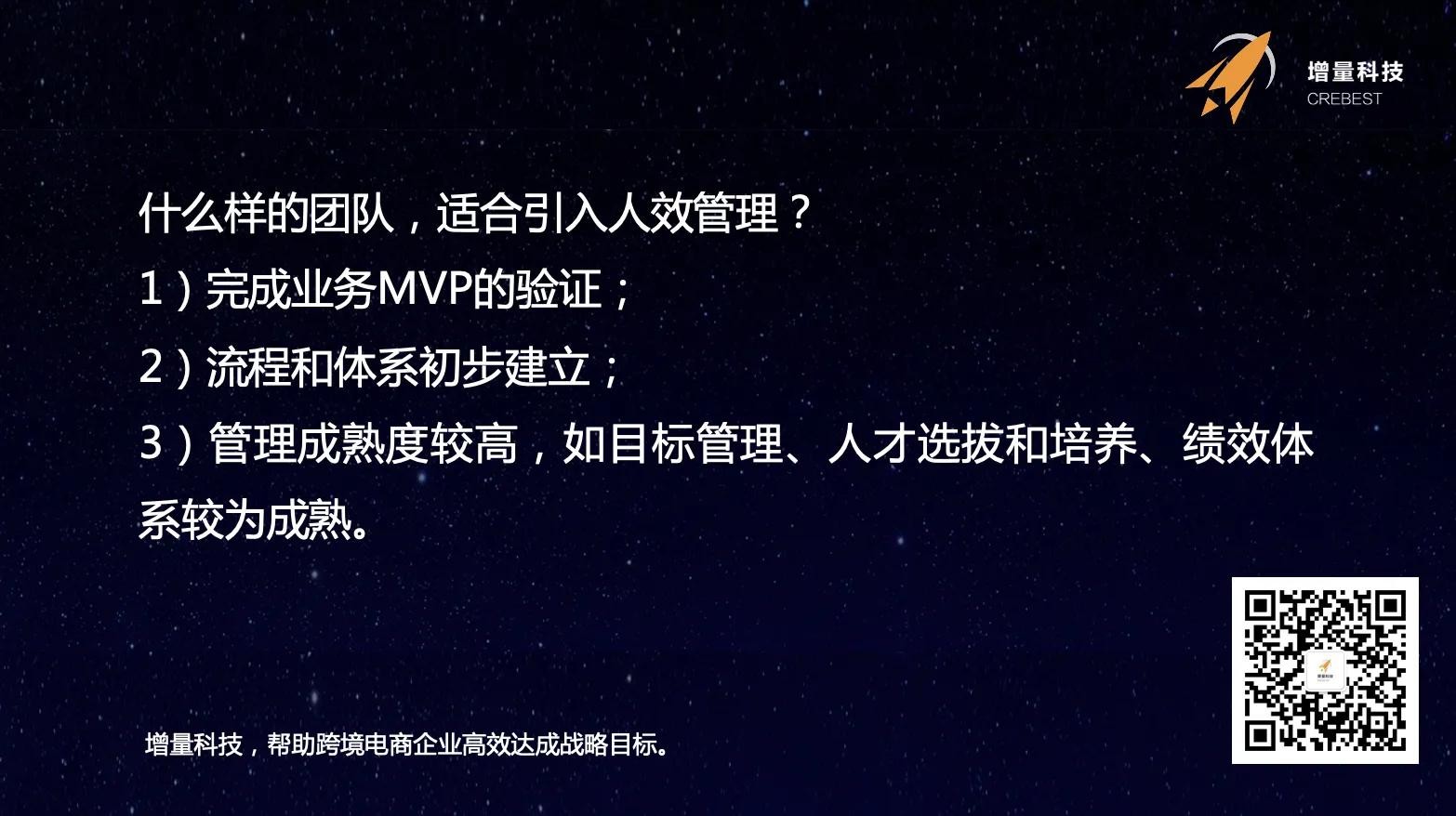7、什么样的团队,适合引入人效管理?1)完成业务MVP的验证;2)流程和体系初步建立;3)管理成熟度较高,如目标管理、人才选拔和培养、绩效体系较为成熟。