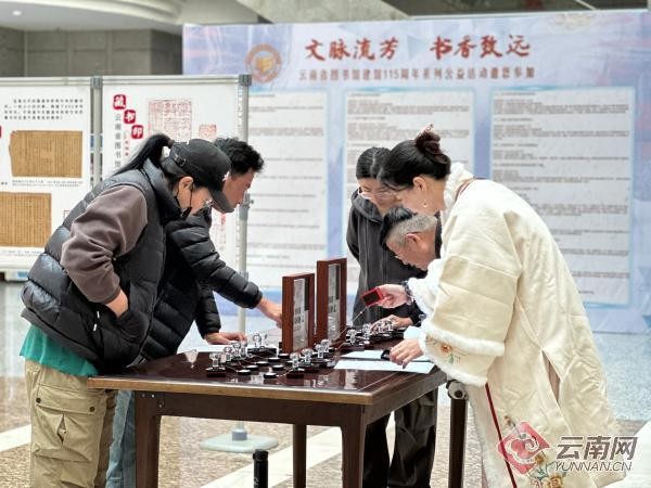 本次展览也是云南省图书馆建馆115周年系列活动之一。记者在云南省图书馆看到,同为系列活动的“云南省图书馆藏书印撷珍”展也已在二楼大厅向公众开放。展览精选云南省图书馆馆藏文献中部分特色藏书印,分“馆名变迁”“最早的章”“寺院章”“皇帝章”“机构章”“私人章”“记事章”“流传章”“闲章”“异形章”“钤印本”十一个板块进行展示,共展出藏书印130余枚。现场特设的藏书印集章处更是吸引了不少市民和读者前来收集印章,在集章之旅中,收获知识、享受乐趣。