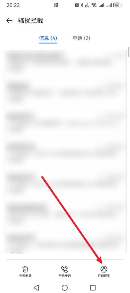 第二步:进入骚扰拦截页面后,我们再点击右下角的【拦截规则】;