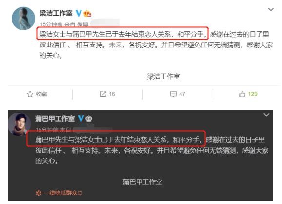 蒲巴甲梁洁两人通过各自的官方工作室发声,文字措辞都相当严谨,看起来也相当的体面,统一一样的文案看起来应该是和平分手。