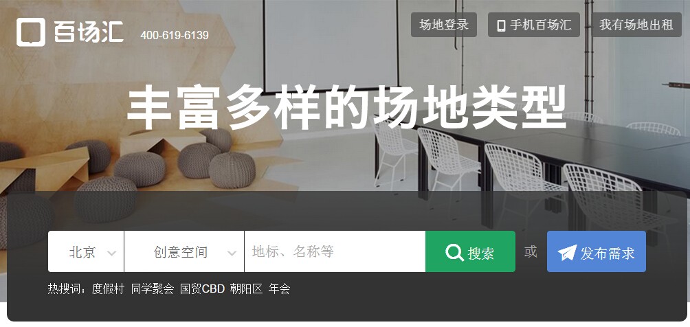 共享经济下的场地租赁平台,会议、聚会场地一键预定。提高各类商业、个人空间及场地的利用率,让闲置的资源也能产生经济效益。