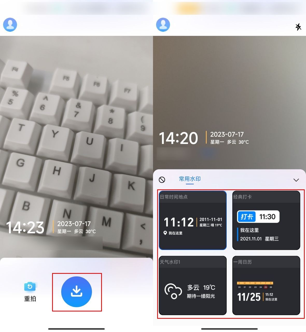 而且,这个软件还有一个明显的特点就是操作简单,只需要打开软件,再选择水印样式并拍摄下需要增加水印的场景,接着点击下载按键就可以啦。