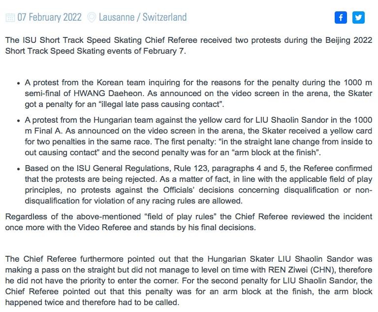 国际滑联在官方声明中确认:国际滑联短道速滑裁判长在2月7日北京2022冬奥会短道速滑赛事期间收到了两次申诉——韩国队对黄大宪在1000米半决赛中被判犯规提出申诉,匈牙利队对刘少林在1000米决赛中吃到黄牌被取消成绩提出申诉。