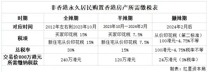 按香港此前全辣期的政策,一套800万售价的房产,需要额外缴纳高达240万元的各种税费,2023年10月,由于市场低迷,香港财政司将税率减半征收,额外税费降至120万港元。