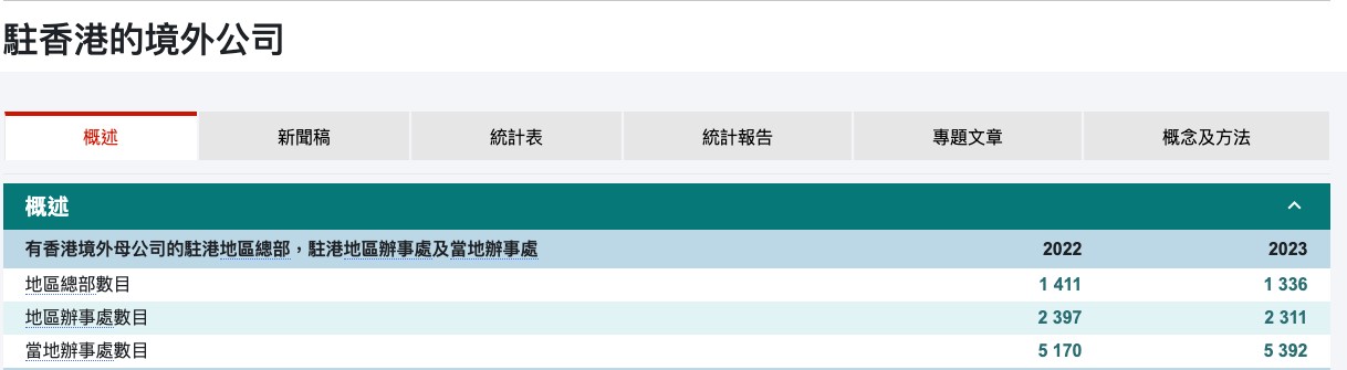 根据官方披露的数据显示,2023年香港境外公司数量相较于2022年增长了222家,但地区总部却从2022年的1411家减少至2023年的1336家。