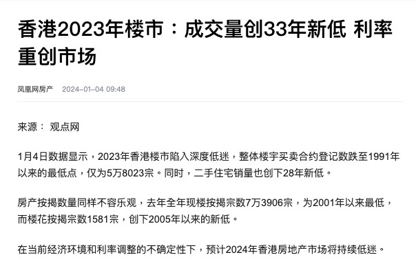 2023年,香港楼市成交量仅为58000宗,创下了1991年以来的历史最低水平,二手住宅成交量同样录得28年来的新史低,房产按揭方面,全年按揭宗数录得2001年来新低,楼花按揭宗数录得2005年以来新低。