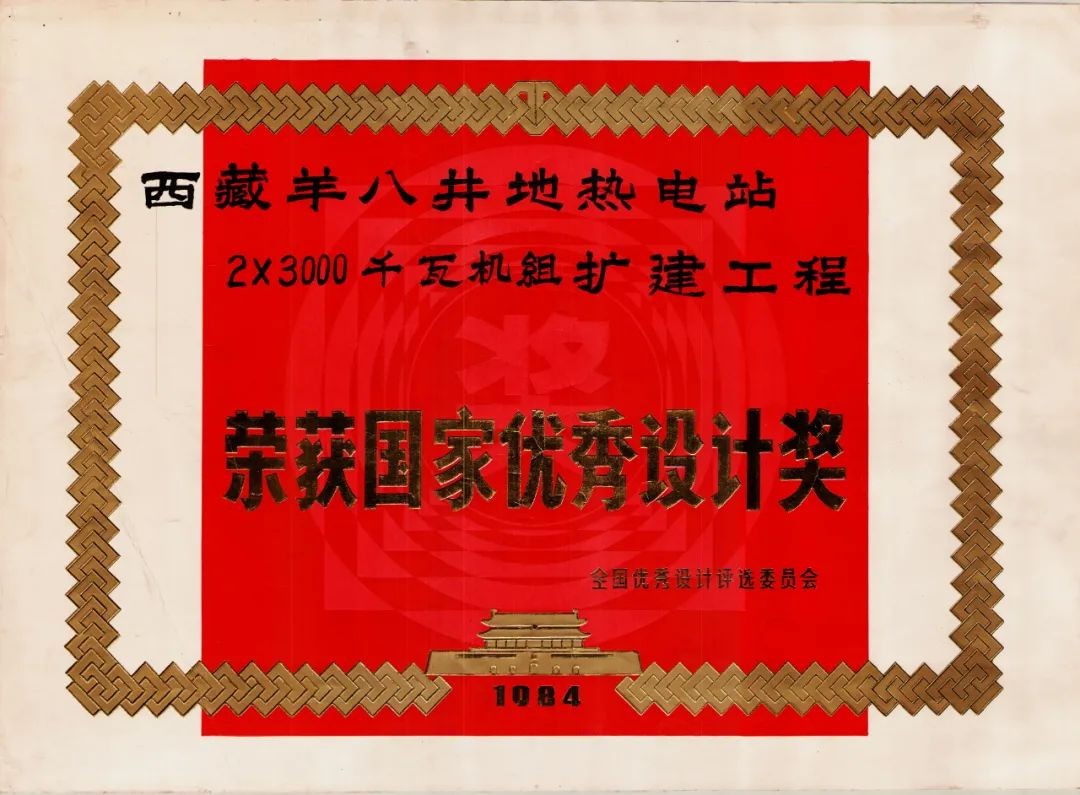 1984年2月,羊八井地热电站二期2×3000千瓦机组工程荣获国家优秀设计金奖。