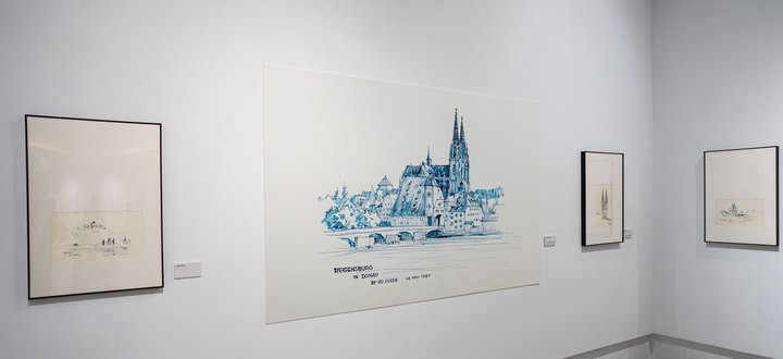 因为从事建筑规划、风景园林工作,胡理琛先生考察省内外名山大川、文化遗产,常常为美妙的自然风光和精妙建筑所激动:浙北水乡、浙南山村、壮美黄山、峥嵘雁荡、秀丽漓江、古拙桂北……,乃至德国莱茵河畔的神奇古堡,均行诸笔端,以备卧游。他或早出,或晚归,或趁餐前饭后的间歇,快跑至景前,于喘息未定之际,极速写意大自然与建筑美景。“亲手画过的,相比看过与拍摄,记忆和理解的深度是不同的。”而且,他还针对不同对象,不同气象,随机应变,应用随身画具,画出了钢笔、炭笔、炭棒、水墨等不同式样的速写效果。