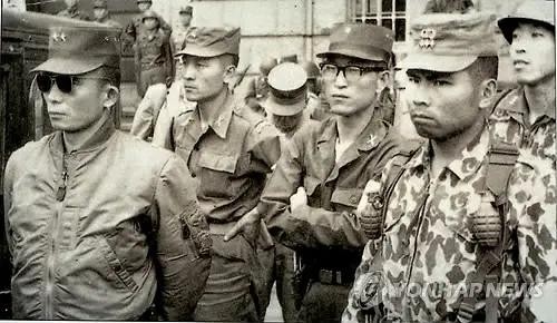 1961年5月18日,政变的主导力量,观看陆军军校生们的5.16军事政变支持示威。左起:朴正熙少将、朴钟圭少校、李洛善少校、车智澈上尉。