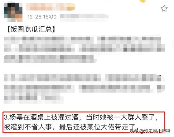 众所周知,女明星为了自己的星光前途与一些大佬喝酒也是很正常的事情,被曝杨幂一杯酒接着一杯酒下肚,醉到不省人事。甚至还被曝某个颇有权势的大佬直接灌醉带走。虽然下面还有一些截图的图片,但是都不足以成为最终的证据。