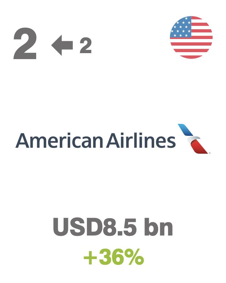 第2名:美国航空,来自:美国,品牌价值:84.88亿美元