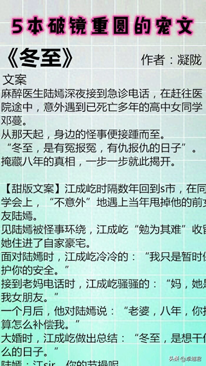 5本破镜重圆的甜宠文——强推《冬至》一定不要错过 2025-09-21 08:12 点击: 来源:皮坤网 摘要:5本破镜重圆的甜宠文——强推《冬至》一定不要错过 卓越君又来了,在给大家推荐几本破镜重圆的宠文。希望你们能喜欢。请关注、转发、评论谢谢大家。 5本破镜重圆的甜宠文——强推《冬至》一定不要错过卓越君又来了,在给大家推荐几本破镜重圆的宠文。希望你们能喜欢。请关注、转发、评论谢谢大家。 相关标签: 上一篇:日照港口医院专家——王珍 下一篇:拜年不用发愁了,中国亲戚最全关系图总结好啦❗❗