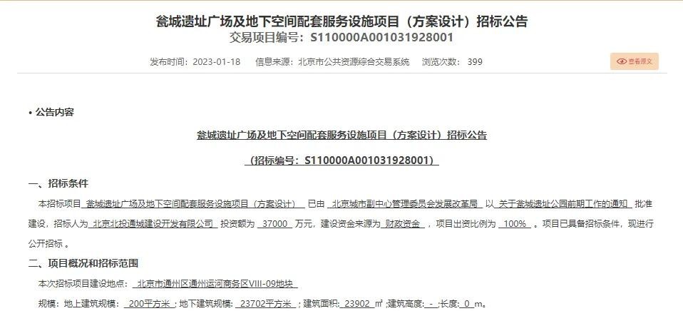 去年1月,相关网站就发布了“瓮城遗址广场及地下空间配套服务设施项目(方案设计)招标公告”,投资额为37000万元。