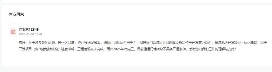 通州区回复:经北投通城核实,通运门地铁站内已完工,但通运门站各出入口附属设施均位于开发商地块内,与各地块开发项目一体化建设,由于开发项目(含代建地铁结构)进度滞后,工程建设尚未完成,预计2025年底完工。目前通运门地铁站不具备开通条件。