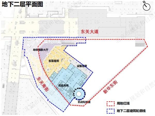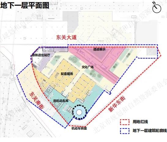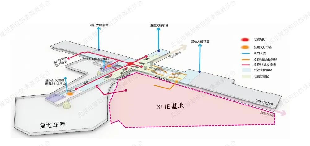 地面上是瓮城遗址公园;地下一层为原址回迁的瓮城遗址展示区、非机动车停放区、便民服务空间等区域;地下二层为机动车停车区、地铁6号线、地铁S6线以及远期的103线三线地铁换乘空间,通过拓展建设便利店、饮品店等便民设施,方便换乘市民及游客停留休憩,提供良好的换乘和游玩体验。