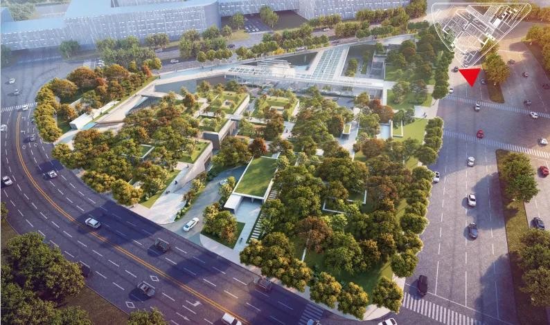 其中,地下一层下沉广场承担瓮城遗迹展览任务,作为进入地铁大厅的主通道方便周边居民乘坐地铁;地下二层与地铁6号线通运门站站厅层平接,地面为园林绿化,服务于周边的办公及居民区,是运河商务区重要的城市公园。