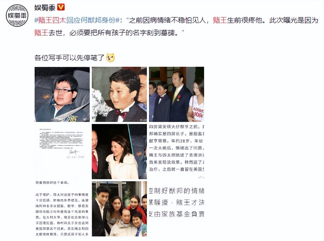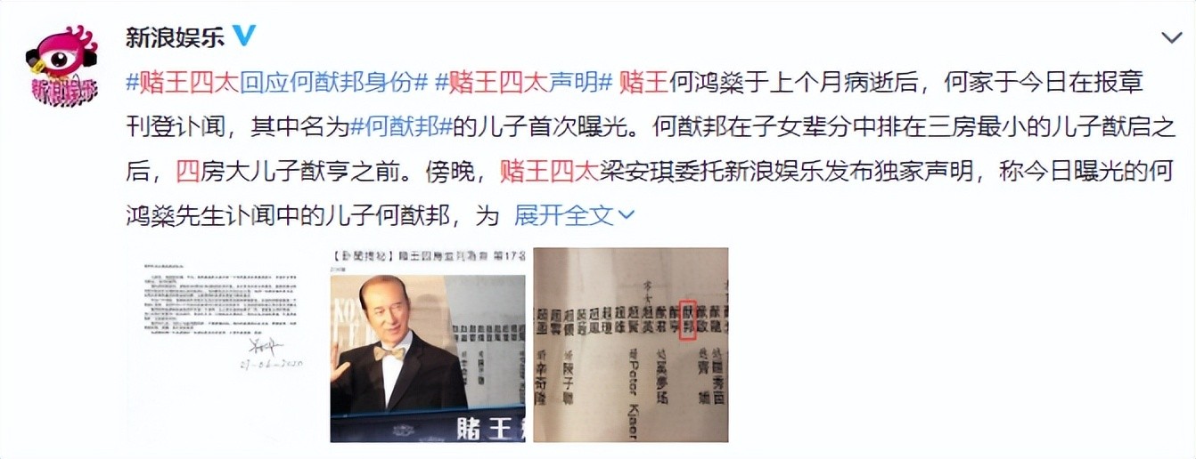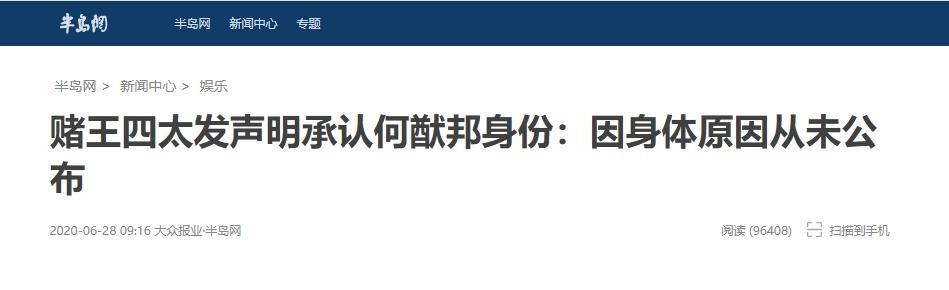 信源来源:半岛网 2020-05-28 赌王四太发声明承认何猷邦身份:因身体原因从未公布