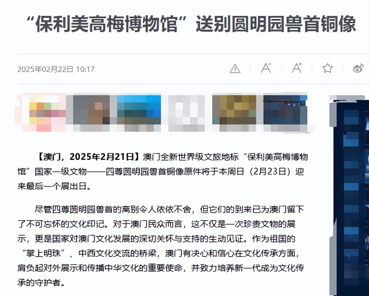 新浪新闻 2025-02-22 “保利美高梅博物馆”送别圆明园兽首铜像