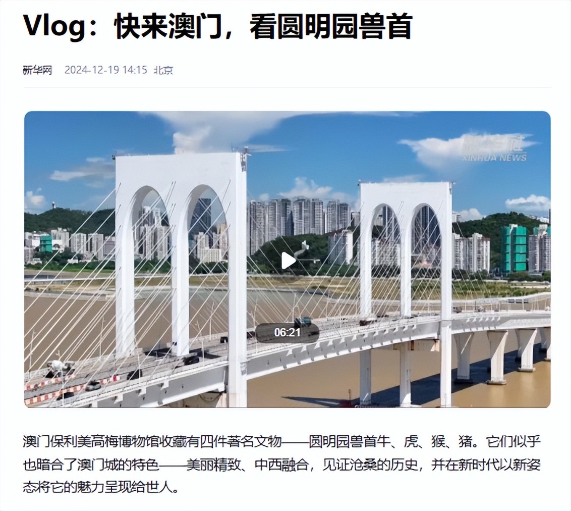 信息来源:新华网 2024-12-19 Vlog:快来澳门,看圆明园兽首