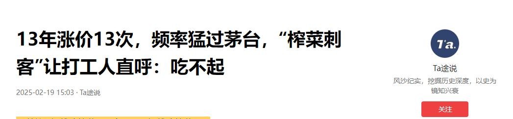 13年涨价13次,频率猛过茅台,“榨菜刺客”让打工人直呼:吃不起