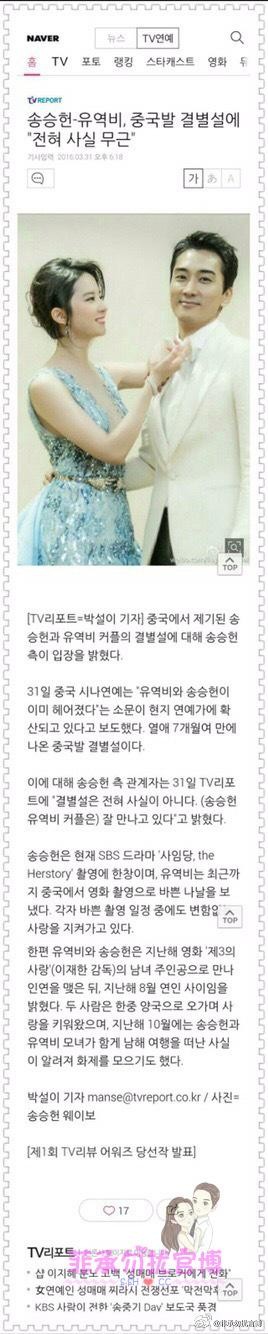 31日下午,宋承宪方也对“分手说”作出了回应,称“该报道并非事实,目前两人正在好好交往中,没分手。