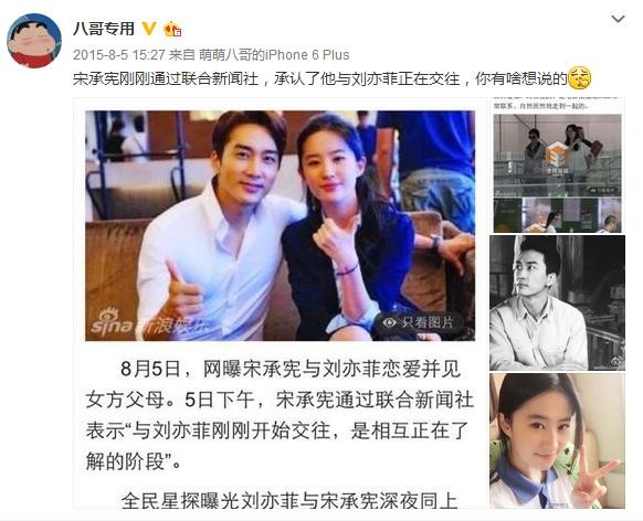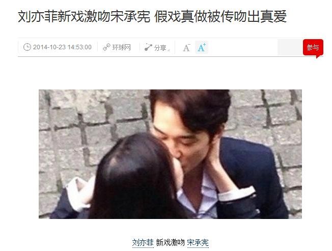 下午,韩国欧巴宋承宪通过联合新闻社大方承认恋情,表示“与刘亦菲刚刚开始交往,是相互正在了解的阶段”。