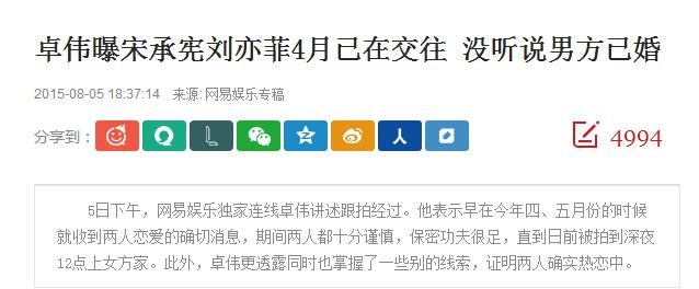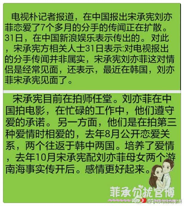 31日中午,名为“圈外评论人”的网友也发布消息称刘亦菲与宋承宪分手了。