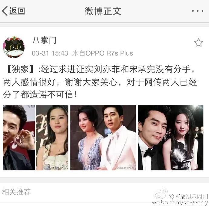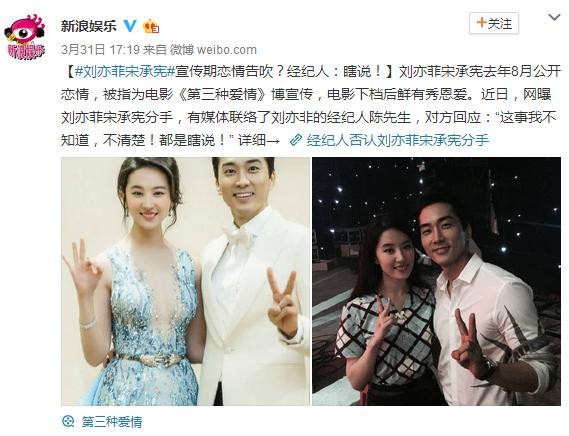 30日,名为“八卦圈一姐”的网友爆料称刘亦菲与宋承宪分手了,并称“娱乐圈有一种恋情叫我们都在宣传期”,暗指两人恋情是为炒作。